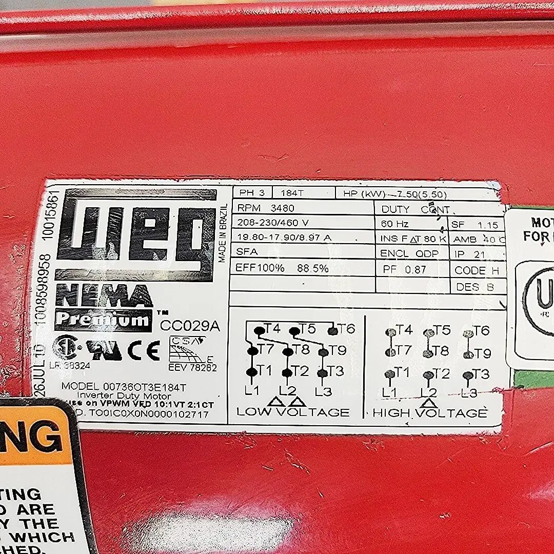 - Motor: WEG NEMA Premium, 7.5 HP, 3-phase, 208-230/460 V, 60 Hz, ~3480 RPM, frame 184T (ODP)
