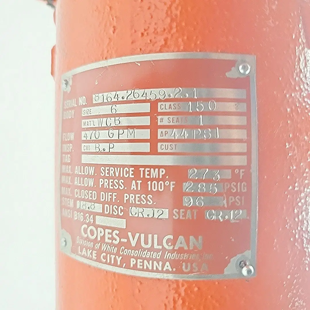 OEM Copes-Vulcan control valve, 6″ ANSI Class 150 with WCB body and CR12 seat trim.