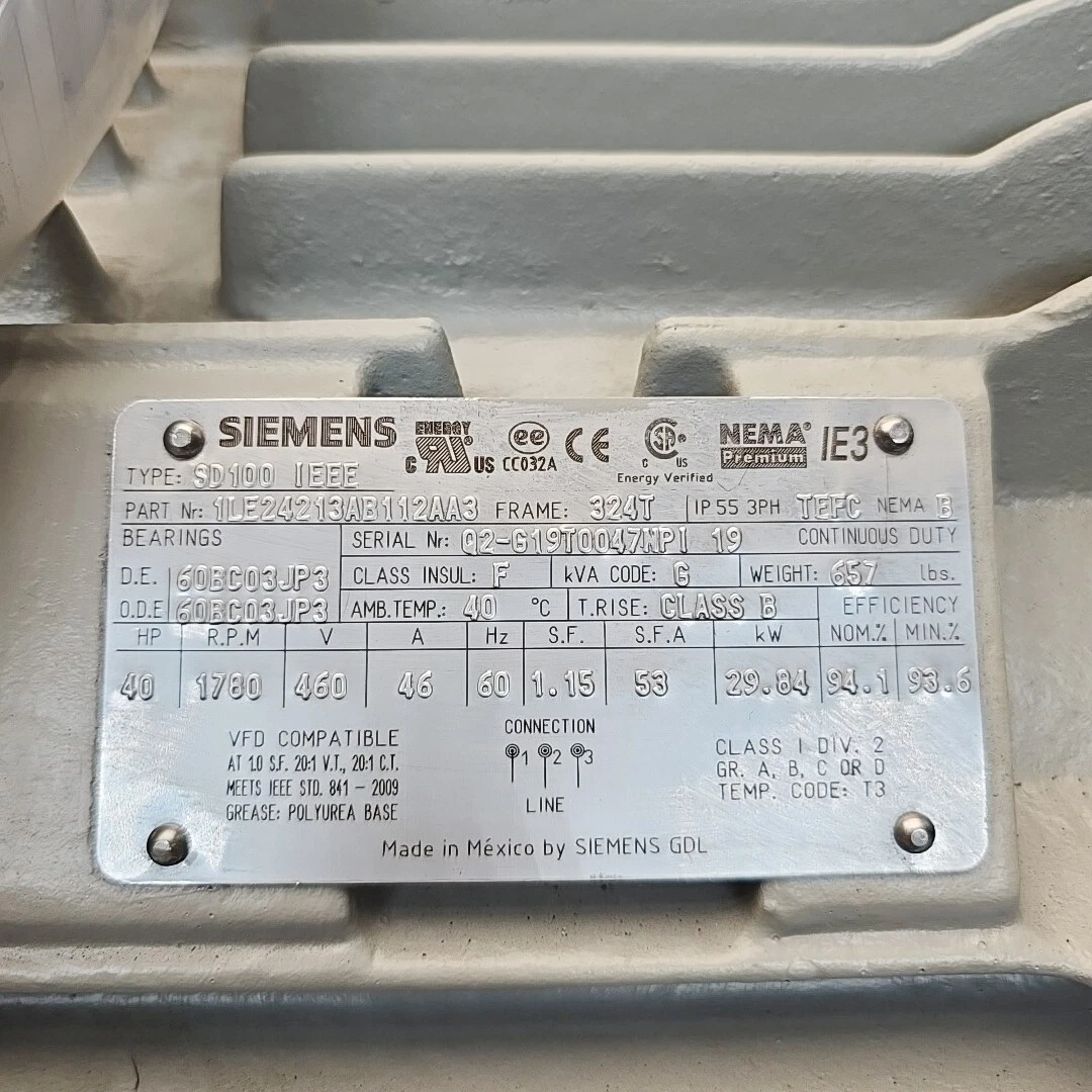 The Siemens SD100 40 HP Motor (model 1LE24213AB112AA3) is a high-efficiency AC motor designed for rugged industrial applications. Built to IEEE standards, this motor combines 40 horsepower capacity, 460V three-phase power, and 1765 RPM speed for dependable performance in continuous-duty service.