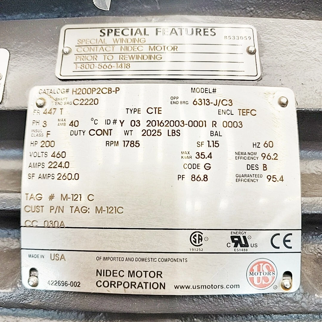 US Motors 6313-J/C3 200 HP Motor 1785 RPM 3PH TEFC
